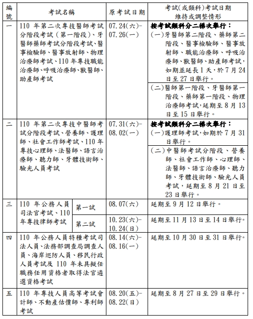 考選部因應中央流行疫情指揮中心業於昨(7)日發布疫情三級警戒持續至6月28日,原定於近期舉行之110年第二次專技人員高考醫師考試分階段考試(第二階段考試)、110年專技人員普考外語導遊人員第二試(口試)、110年公務人員高考三級暨普通考試等3項國家考試均延期舉行;另110年司法官特考及律師高考第二試,亦配合延後一週舉行,請應考人留意各該考試日期變動情形,妥適規劃個人應考行程(調整詳情請見附表及考選部全球資訊網110年度考試期日計畫表)。